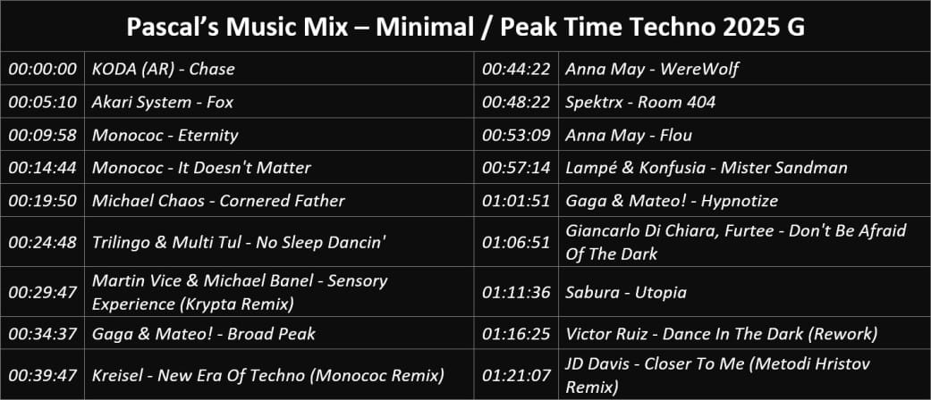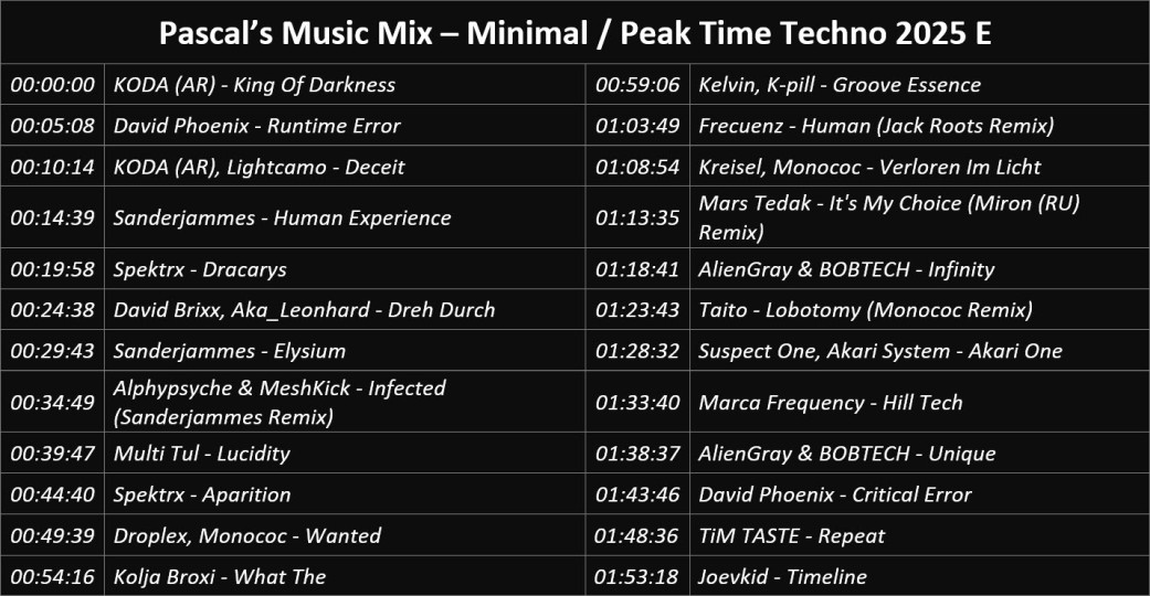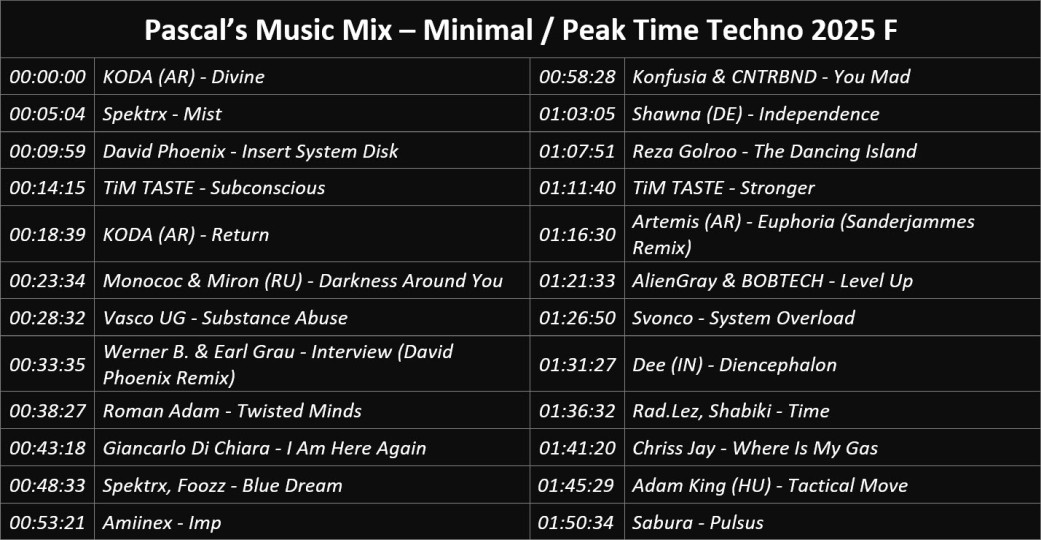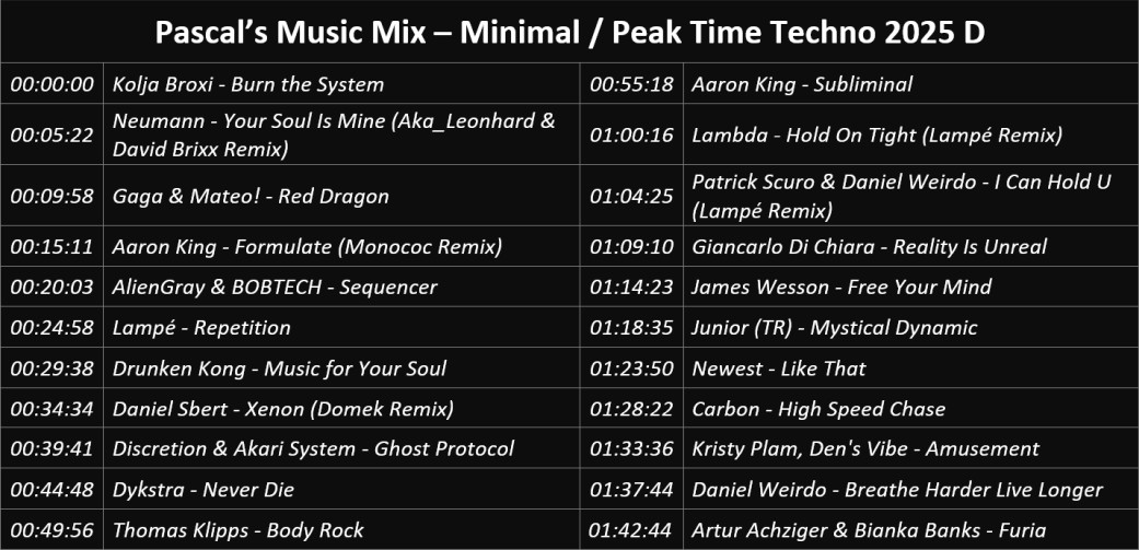 These are my newly created Minimal Techno Mixes, or as it is now called Techno Peak Time / Driving, my genre of predilection since 2008, with my favourite tracks that passed the ‘test of time’ or are current.