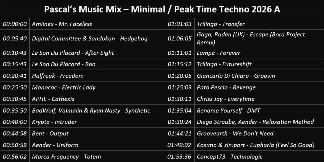 This Mix contains some of my favourite Minimal Techno – or as it is now called Techno Peak Time / Driving – tracks from 2026 of 124 to 132 BPM.